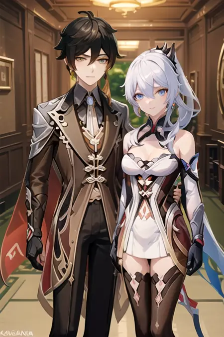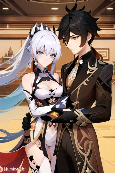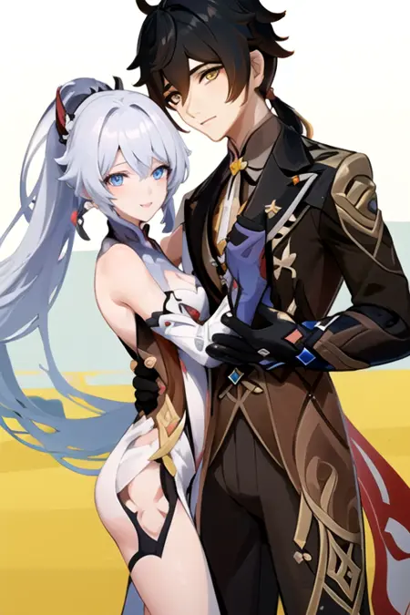 | 训练词汇 | (Zhongli, 1boy, short hair, brown hair, black hair, zhongli (genshin impact), yellow eyes), (Kiana, 1girl, long hair, white hair, ponytail, kiana kaslana, blue eyes, medium breasts), man and woman, hetero, 已复制! (Zhongli, 1boy, short hair, brown hair, black hair, zhongli (genshin impact), yellow eyes, collared shirt, long sleeves, brown jacket, single earring, black gloves, black pants, vest, coat, suit, brown jacket, white necktie)已复制! (Kiana, 1girl, long hair, white hair, ponytail, kiana kaslana, blue eyes, medium breasts, hair ornament, cleavage, hair between eyes, bare shoulders, earrings, cape, white dress, armor, white thighhighs, gauntlets) 已复制! |