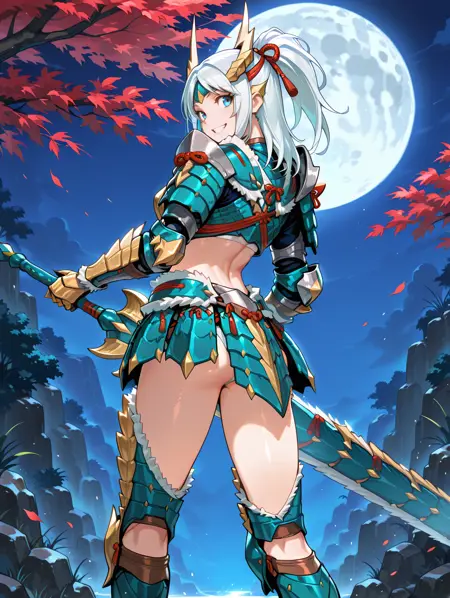 Tags (clothes): blonde hair, ponytail, zinogre armor, cyan headgear, cyan shoulder armor, cyan crop top, cyan gauntlets, cyan armored skirt, cyan armored thigh boots,