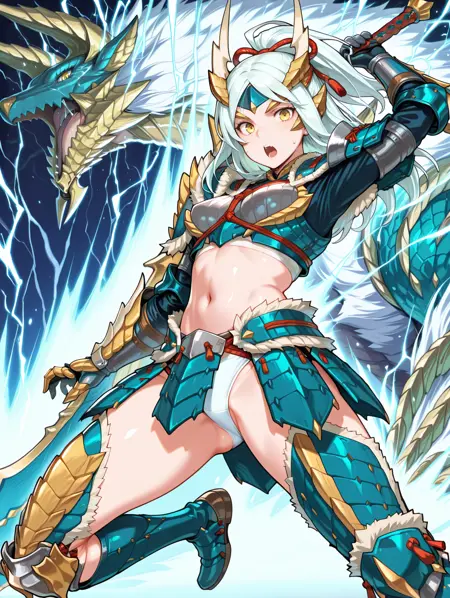 Tags (Personification - Type C): dragon girl, personification, zinogre, yellow horns, long hair, white hair, dragon hands, dragon feet, blue armored skirt, blue breastplate, blue eyes,navel, large breasts, scales, tail raised, black claws,