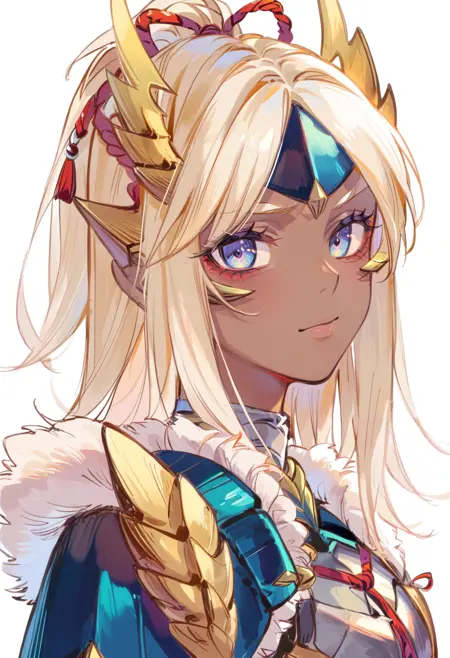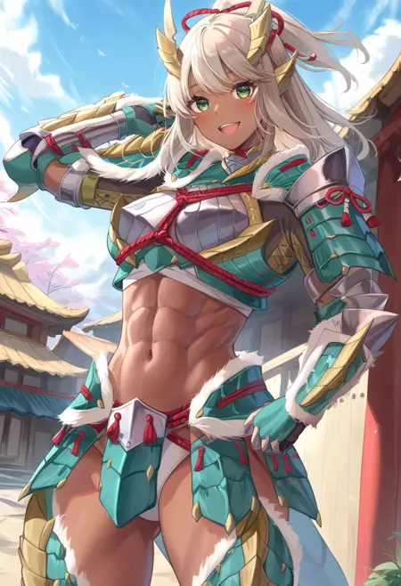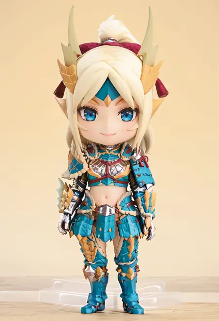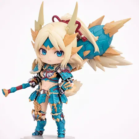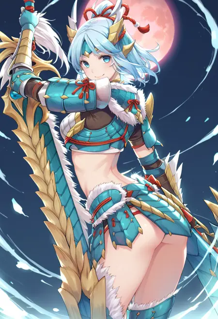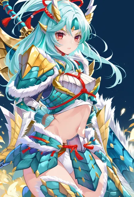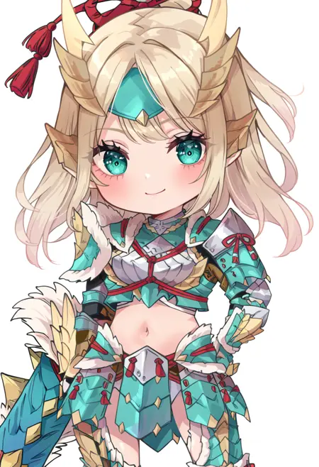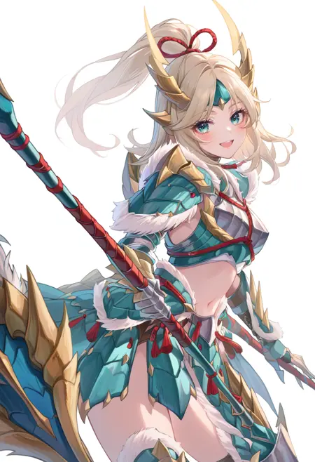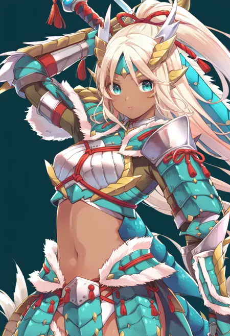 Tags (clothes): blonde hair, ponytail, zinogre armor, cyan headgear, cyan shoulder armor, cyan crop top, cyan gauntlets, cyan armored skirt, cyan armored thigh boots,