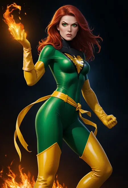 Explore the iconic costumes and transformations of Jean Grey, a central figure in the X-Men universe. This LORA features several of her notable outfits, including Marvel Girl, the 90s attire from Jim Lee's run and the Animated series as well as recently X-Men 97 (released in 2024 on Disney Plus), Dark Phoenix, Phoenix, White Phoenix, an alternative Black & Red Phoenix outfit, and everyday wear. Each design is faithfully recreated using data sourced from official Marvel art and other references, though copyrights may apply.