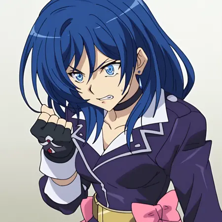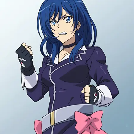 Asaka's Foo Fighter Uniform: asaka_uniform, coat, pink bow, gloves, fingerless gloves, long hair, blue eyes, blue hair, choker, earrings