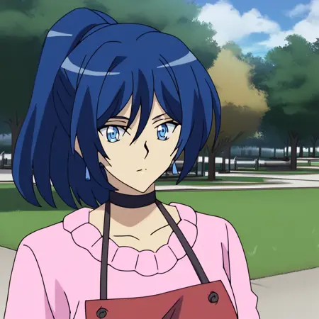 example: asaka_work, 1girl, solo, breasts, pink sweater, red apron, yellow apron logo, choker, blue eyes, blue hair, ponytail, earrings, smile,
