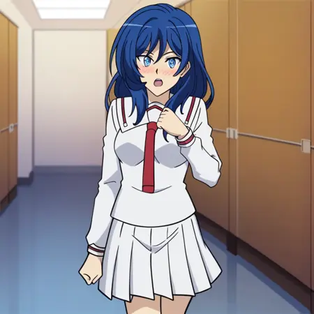 Asaka's School Uniform: asaka_school, school uniform, red tie, serafufu, sailor collar, earrings, white skirt long hair, blue eyes, blue hair
