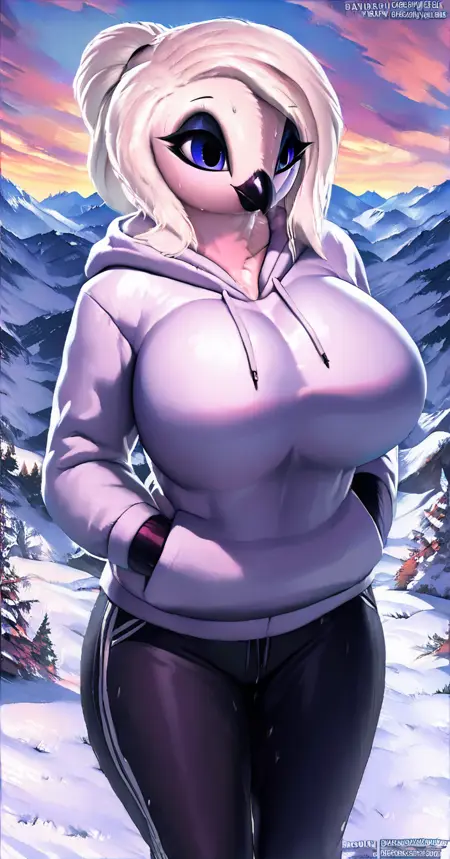 score_9, score_8_up, anthro, beak, big breasts, breasts, female, hair, makeup, white hair, zygodactyl, avian, bird, owl, snowy owl, true owl, 2022, colored, (cherry blossom, ), (bent over, from behind, from side, huge butt, underwear, topless, nipples, hanging breasts, black ass, against tree, looking back, standing, on ground, loose hair, open mouth, ) <lora:Vivian_Rose:1>