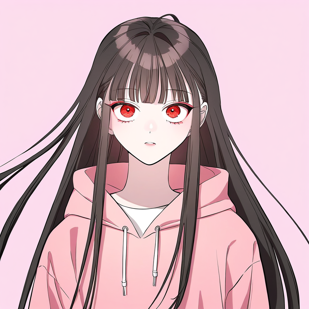 1명의 소녀, 긴 곧은 검은 머리카락을 가지고 있으며, 눈은 크고 밝은 붉은색이다. 앞머리는 곧게 자르고 있다. 피부는 창백하다.
