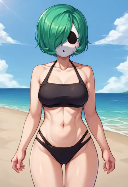 shygalSDXL,1girl,solo,short hair,thighhighs,dress,green hair,belt,hood,hair over one eye,white thighhighs,zettai ryouiki,hoodie,mask,short dress,red dress,hood up,turtleneck dress