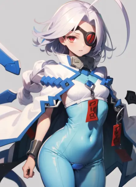 眼帯、ボディスーツ、ケープ、メカ少女、股間プレート