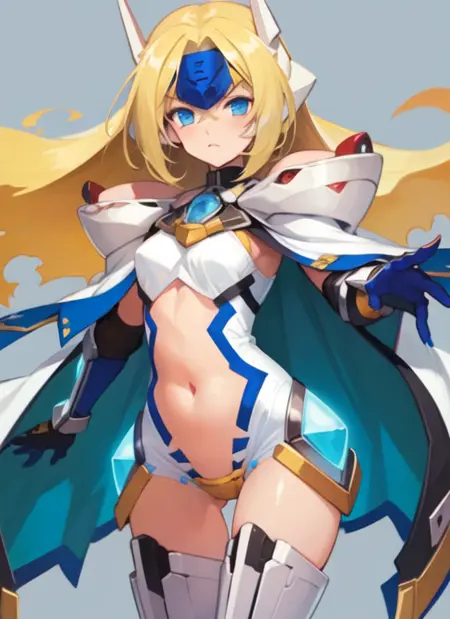 forehead protector, navel, thighhighs, mecha musume, armor, crotch place, gloves, revealing clothes, cape