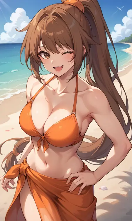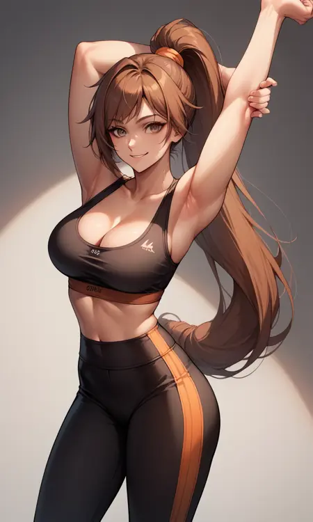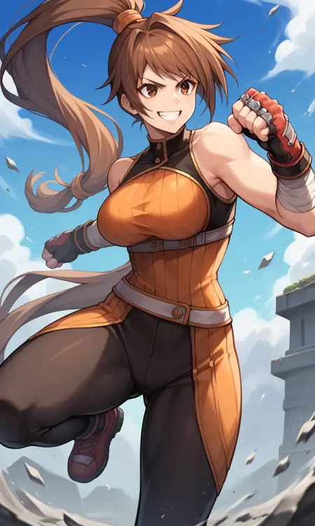 "StrikerDNF,高马尾,棕眼睛,橙色发圈,橙色无袖高领衫,突出胸部,黑色紧身裤,露指手套"