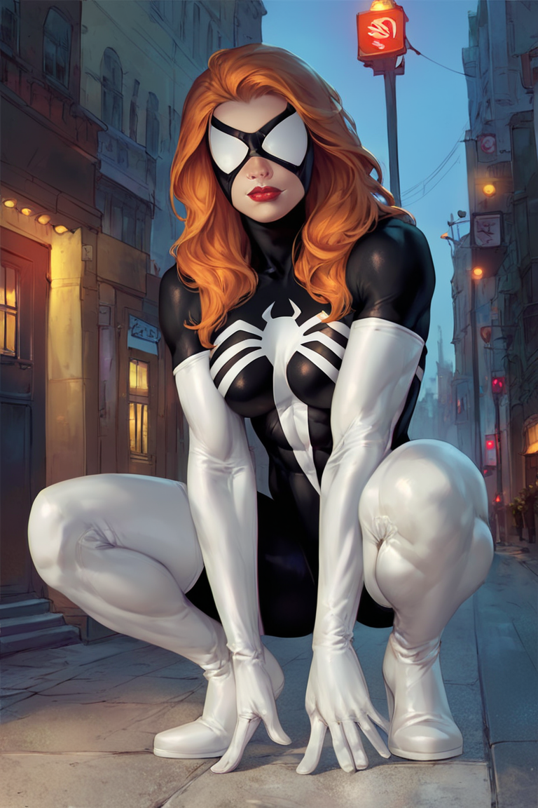 v1.0 - Images without a mask were additionally marked with the swjcsuit token, This token is optional and does not change the image much, the swjcsuit token creates a black outline and an effect more like a comic book, and does not greatly affect the creation of images with a mask. Hair color (red, orange, blonde, yellow) The color of the bodysuit can be black or blue, the color can be any, but these colors do not change the costume much.