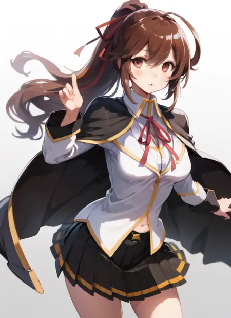 ponytail, ribbon, cape, school uniform, skirt, pleated skirt