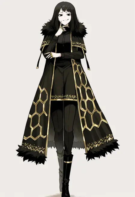 black dress, black coat, open coat, fur trim, gold trim, golden ring, multiple rings, black pants, black boots