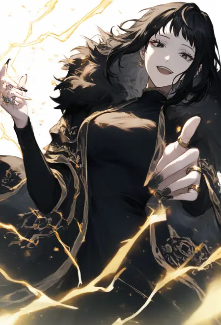 black dress, black pants, black footwear, black coat, open coat, ring, multiple rings, fur trim, jewerly