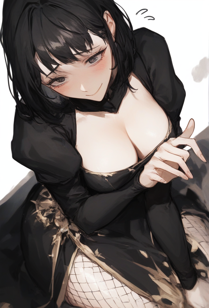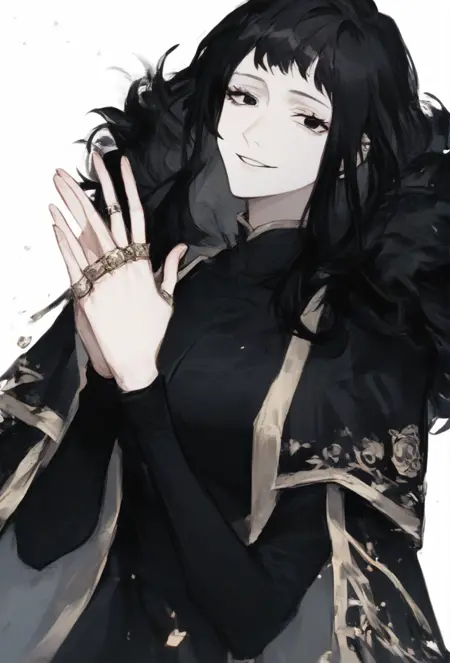 black dress, black pants, black footwear, black coat, open coat, ring, multiple rings, fur trim, jewerly