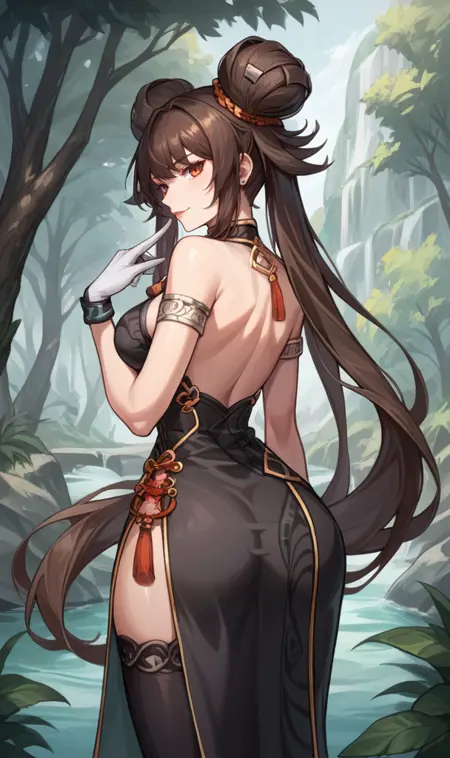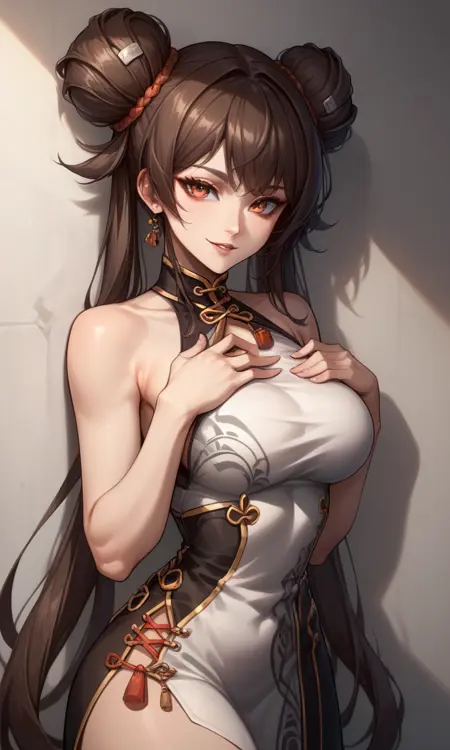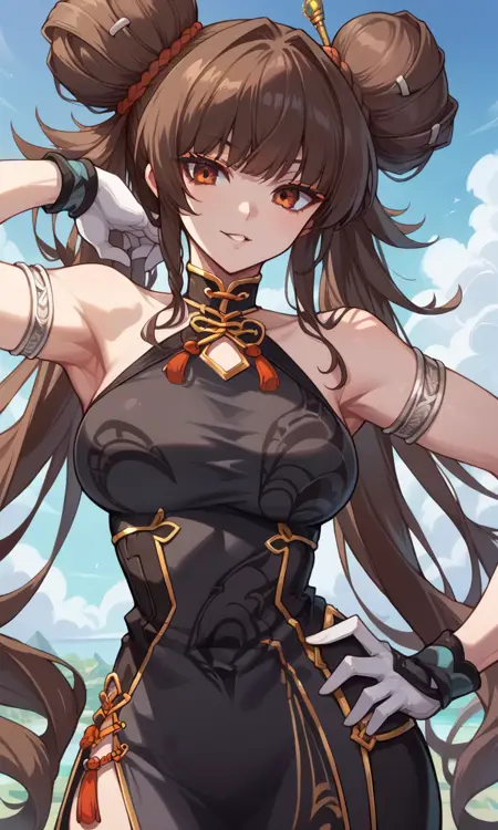 "Nenmasterdnf, 더블 둔부, 트윈테일, 앞머리, 차이나 드레스, 옷 자르기, 어깨 무늬, 팔목장식, 흰 장갑, 검정 허벅지 골프, 사이드 슬릿"