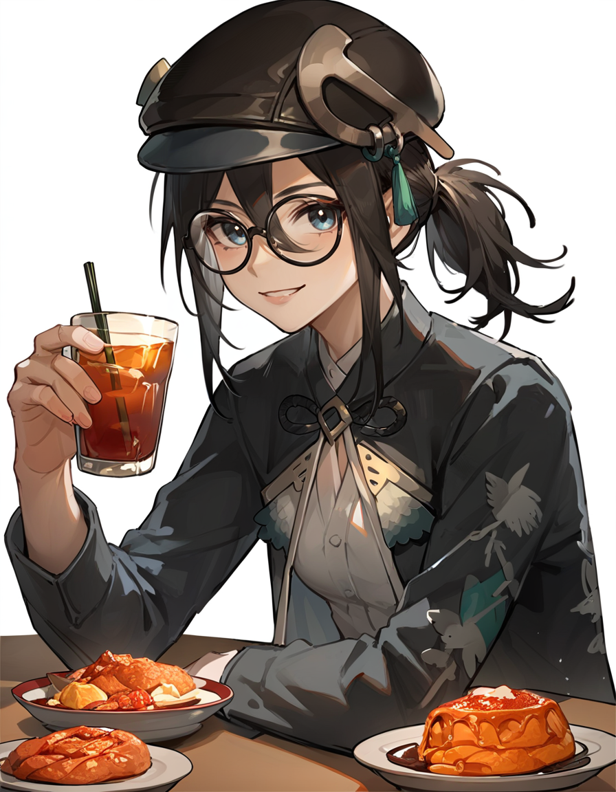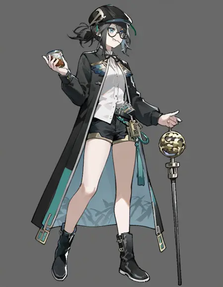 fellowmoon-maque,1girl,solo,shorts,hat,blue eyes,black hair,black shorts,glasses,shirt,black headwear,round eyewear,white shirt,jacket,black jacket,mouth hold,long sleeves,jewelry,