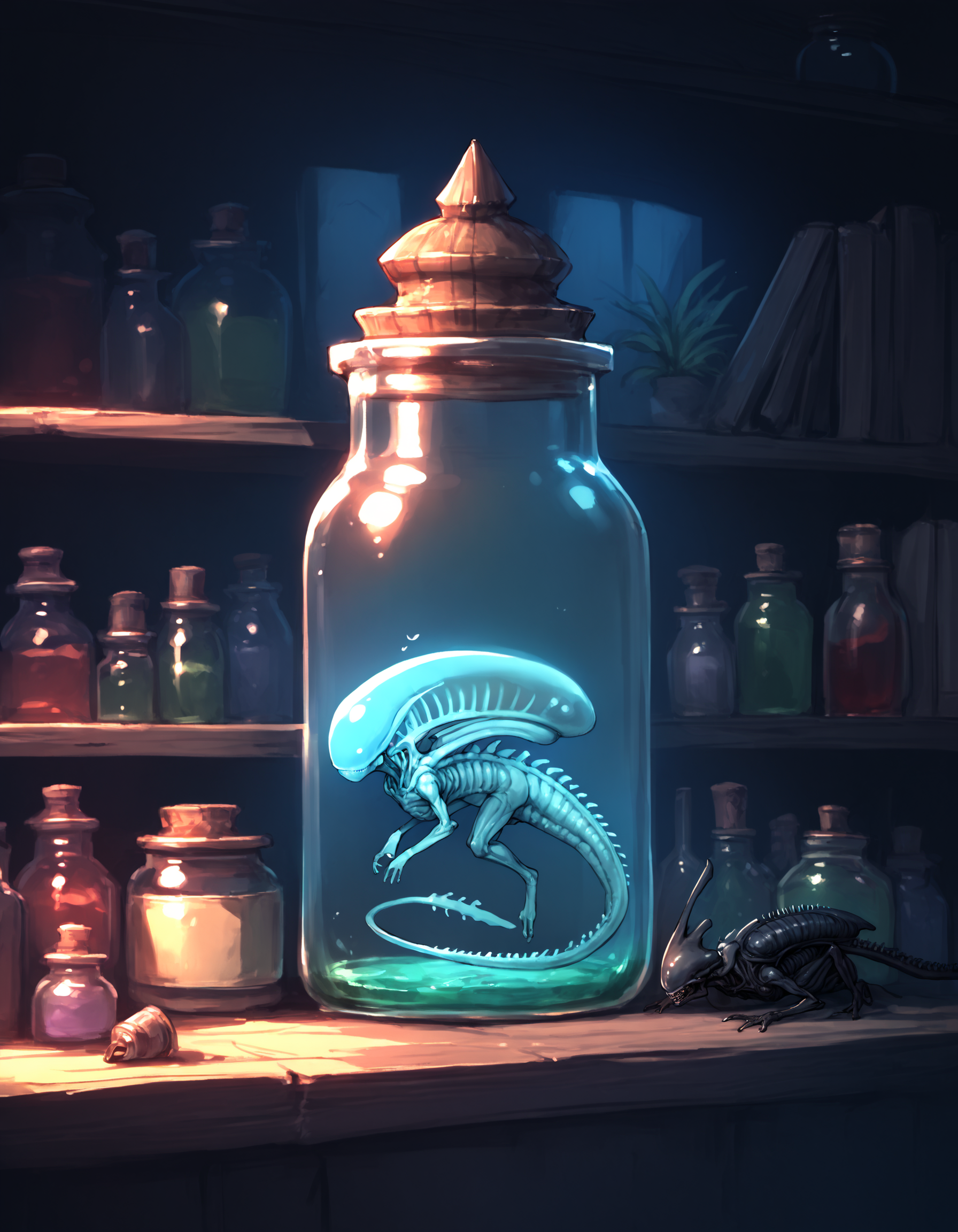 (imp:.9) - replace this with the thing you want, add any descriptors outside the () and adjust the weight until it no longer spills out of the jar, for the dragon image i believe it was (dragon:.8), mechanical parts, ribs, bones, ect.
