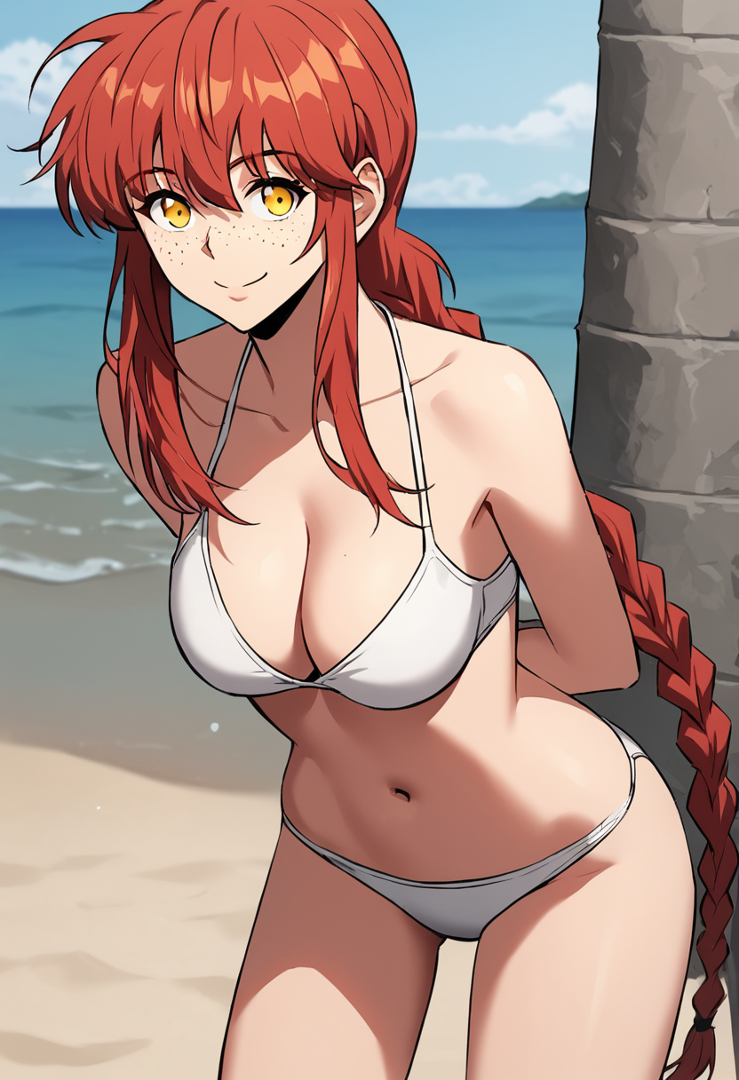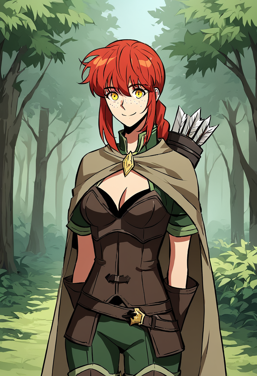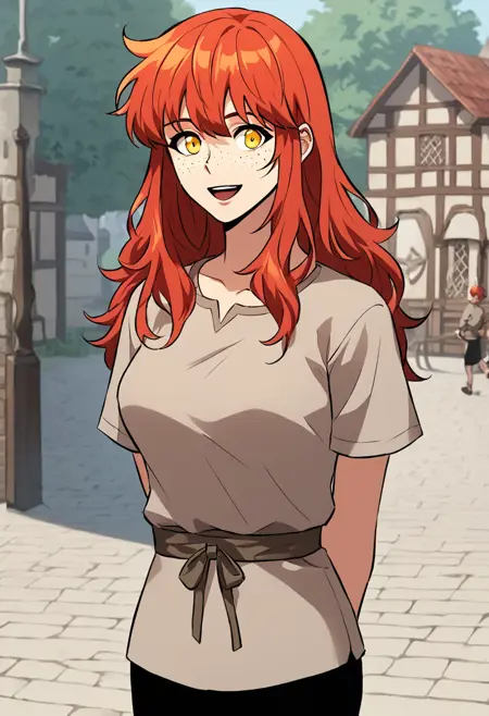Trigger words: jenna_shirai, red hair, long hair, ponytail, braided ponytail, sidelocks, yellow eyes, freckles,manhwa