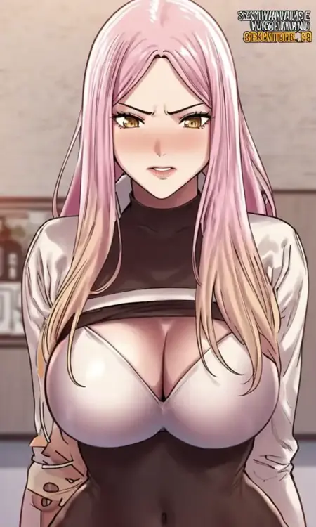Ran KIM from Sextopwatch, yellow eyes, multicoloured pink hair, long hair, fully parted bangs, large breasts