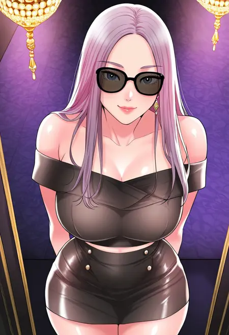 21. ((섹시한 한쪽 어깨 드러난 민소매 검은 상의, 복부, 금장식이 있는 럭셔리한 검은 선글라스, 다이아몬드가 달린 럭셔리한 긴 크리스탈 귀걸이, 섹시한 검은 크롭 스커트, )) 섹시한 검은 하이힐,