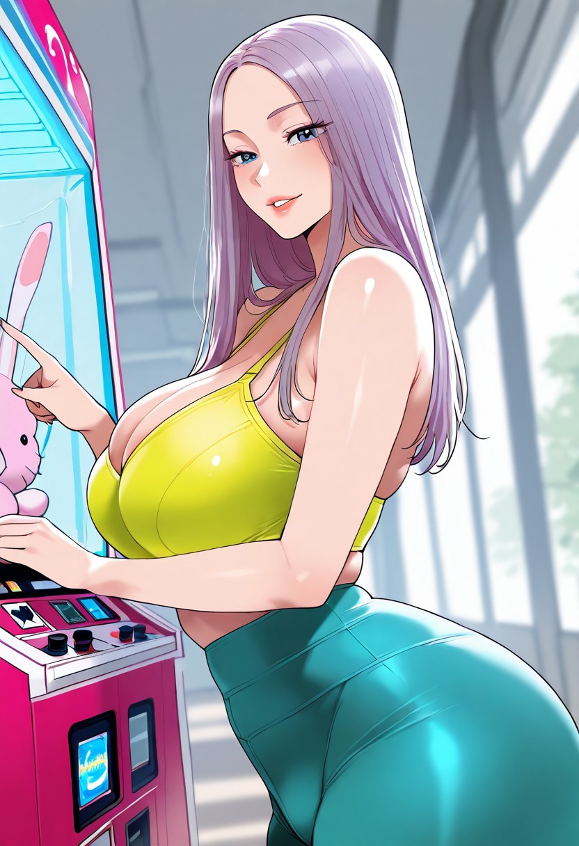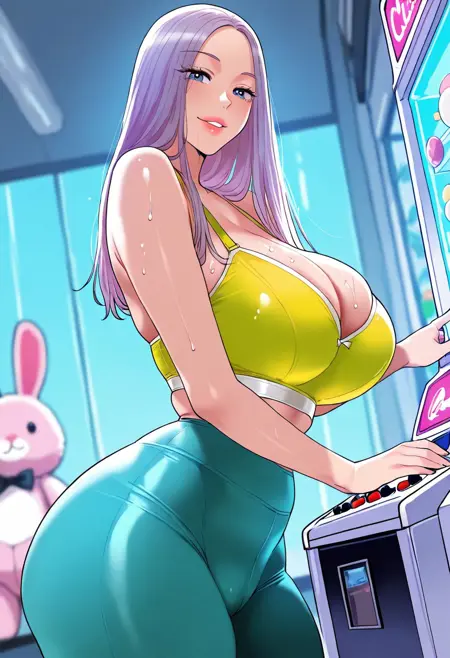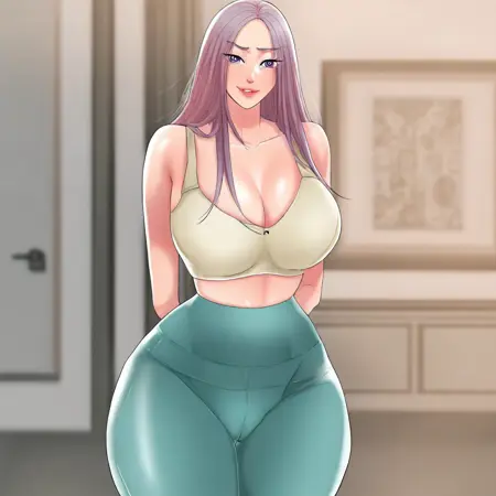 5. ((섹시한 흰 캄리소, 도도한 가슴선, 거대한 가슴선, 복부, 섹시한 보라색 요가 바지, ))