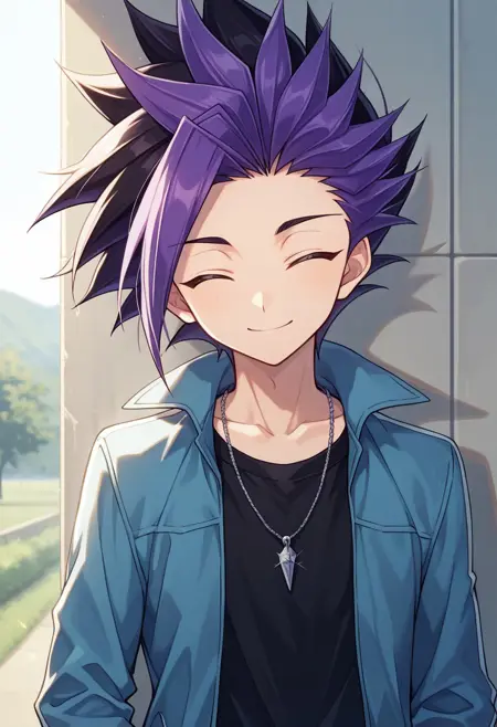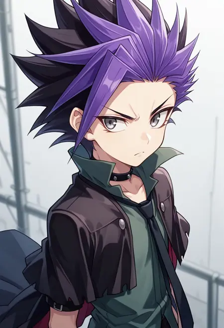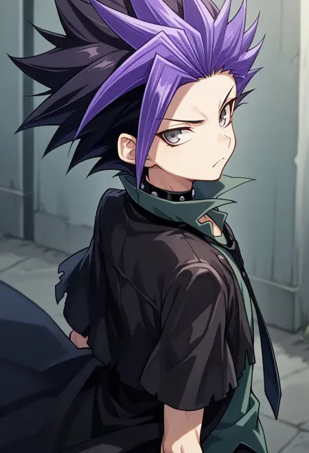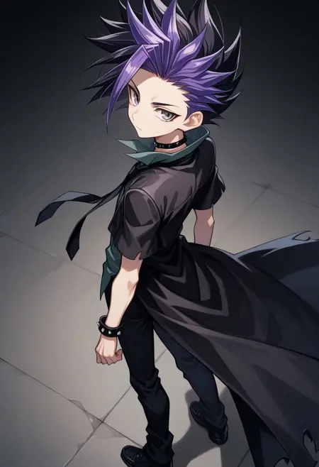 yuto, 1boy, male focus, 黒髪, スパイクヘア, マルチカラーの髪, ネクタイ, シャツ, 黒目, 紫髪, リボン, 染めた前髪, 黒髪, ツートーンヘア, チョーカー, 前髪, トゲ入り服, コート, 靴, 黒靴