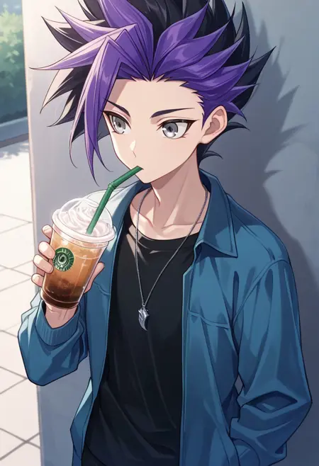 yuto, 1个男孩, 男性焦点, 黑发, 尖刺发型, 多色发, 领带, 衬衫, 黑色眼睛, 紫色头发, 衣领, 染色刘海, 黑发, 双色发, 项圈, 刘海, 荆棘服装, 外套, 鞋子, 黑色鞋子