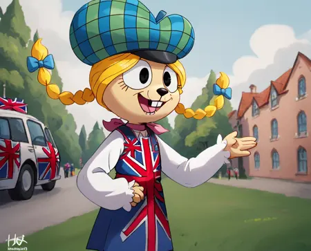 1girl, hat, solo, furry female, hair bow, blonde hair, twin braids, teeth, braid, union jack dress
