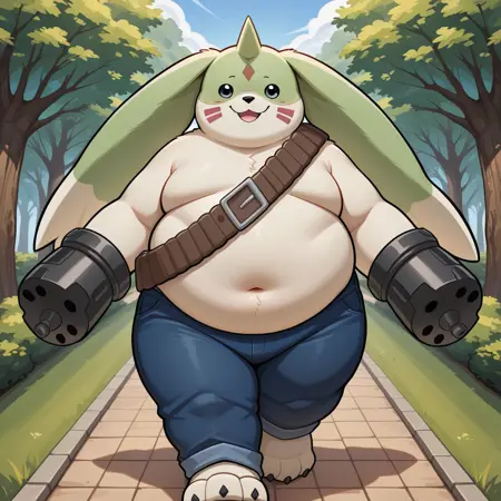 我建议在正向输入中使用:(gargomon, digimon, 胖乎乎的,肥嘟嘟的,长耳朵,机枪手,棕色腰带,牛仔裤,红色面部斑纹,黑色爪垫,)