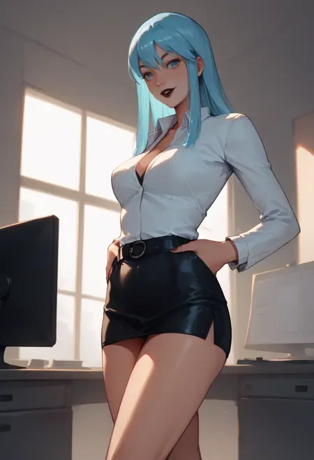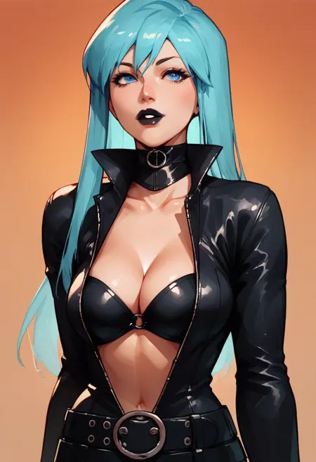 Nemissa, 파란 머리, 파란 눈, 검은 립스틱, 초커, 바디수트, 브라, 부분적으로 지퍼 풀린, 깊은 네크라인, 벨트, 액세서리, 배꼽