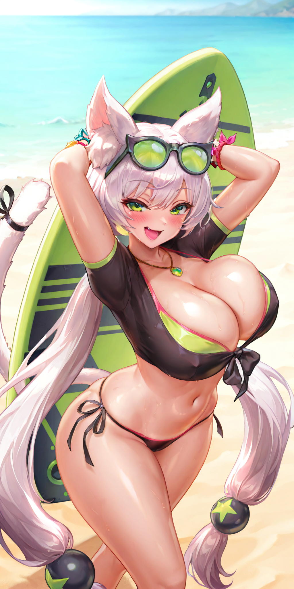 Main tag: alizee, white hair, green eyes, fox ears, low twintails, cat tail, low tied hair.