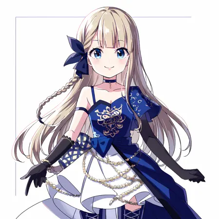 1girl, narumiya suzu, blue layered dress, blue wrist cuffs, black thighhighs, knee boots, suzuza1 hair ribbon,