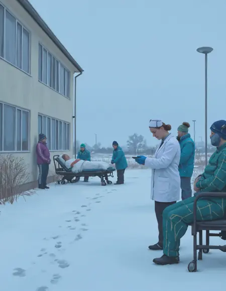 눈 위에 서 있어 장바구니를 들고 있는 여성을 simon-stalenhag 스타일로 그린 디지털 회화