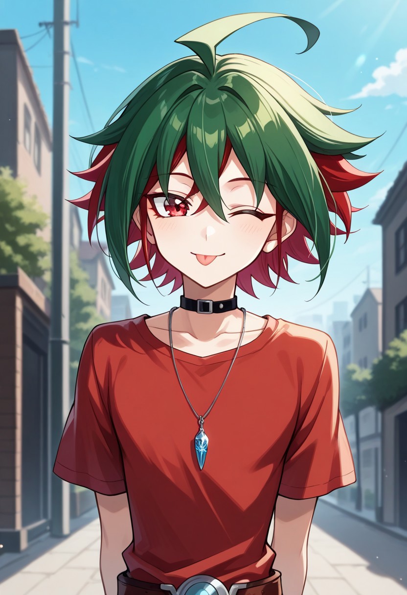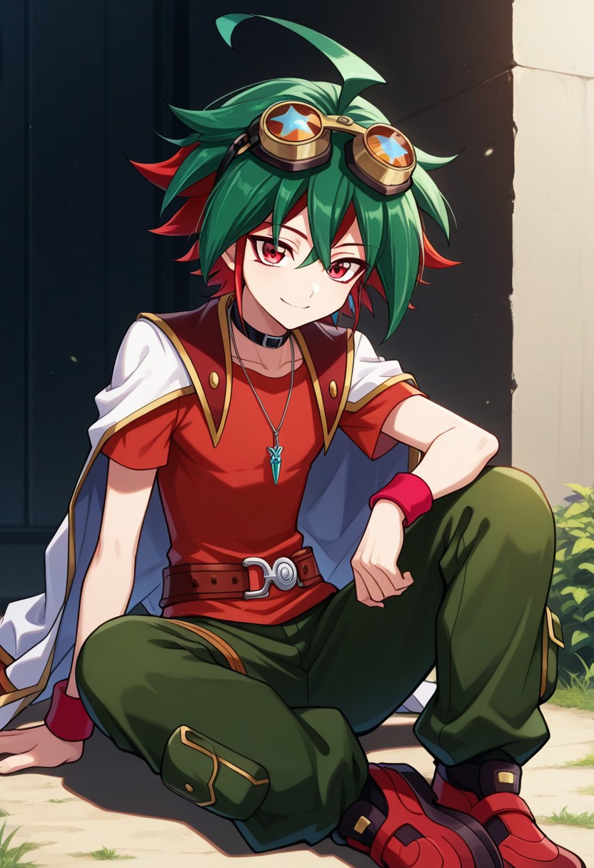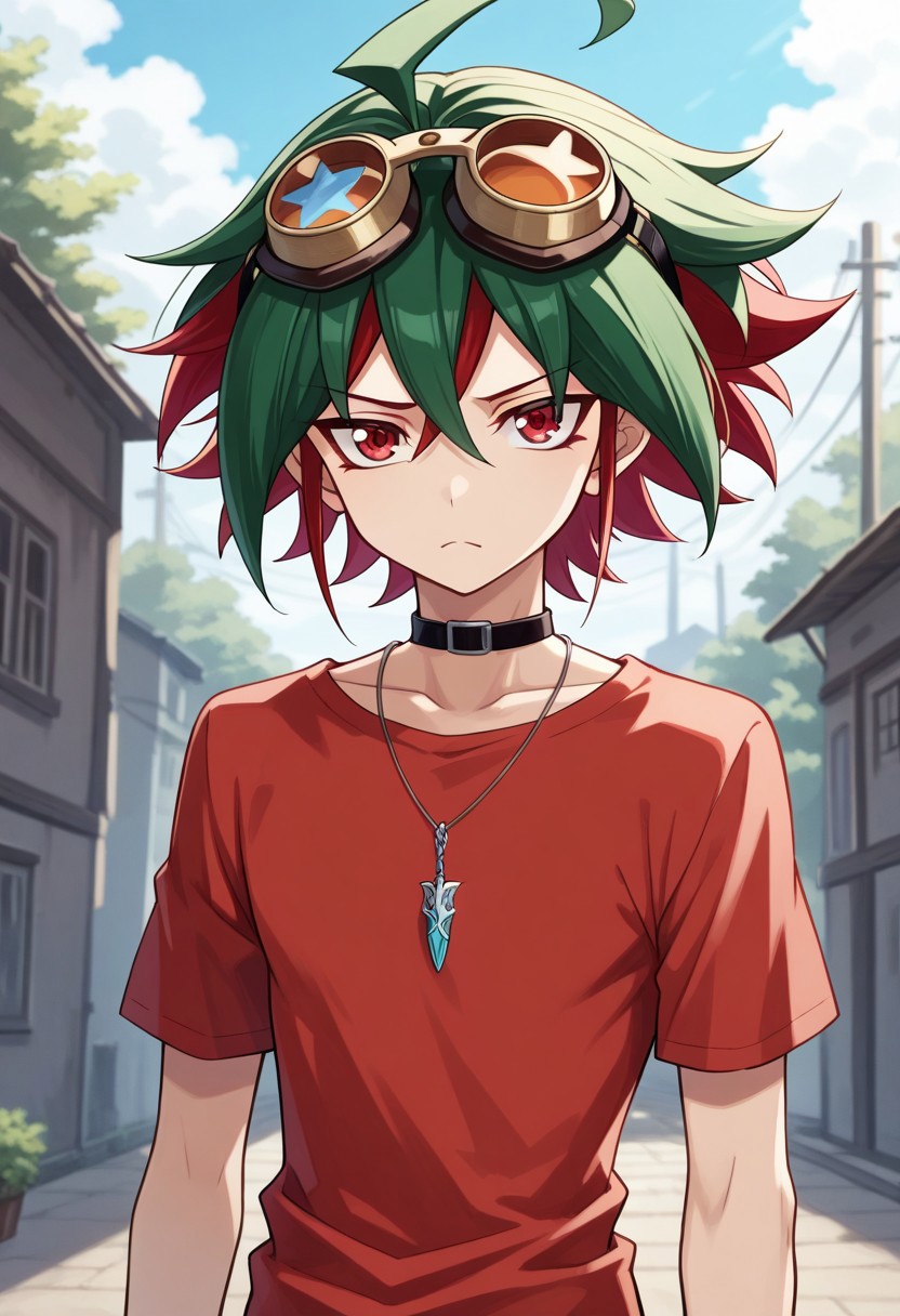 yuya, 1boy, male focus, solo, red eyes, multicolored hair, two-tone hair, green hair, red hair, ahoge, hair between eyes, spiked hair, bangs, goggles, goggles on head, jewelry, necklace, pendant, choker, shirt, red shirt, short sleeves, jacket, white jacket, jacket over shoulder, wristband, belt, pants, green pants, shoes, red footwear,