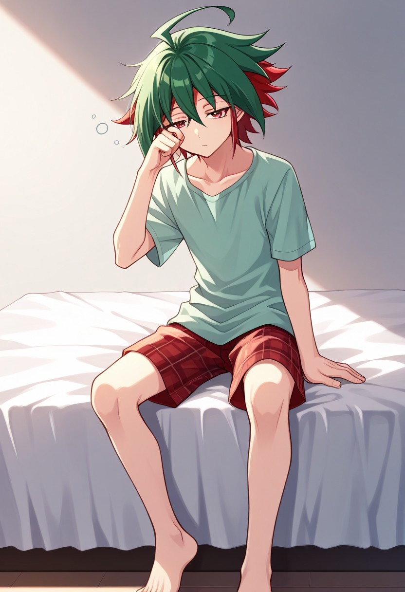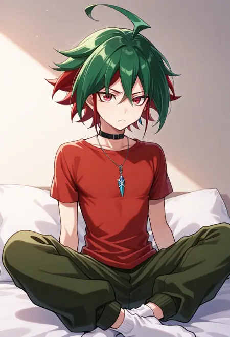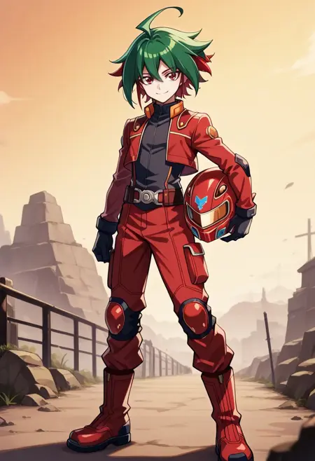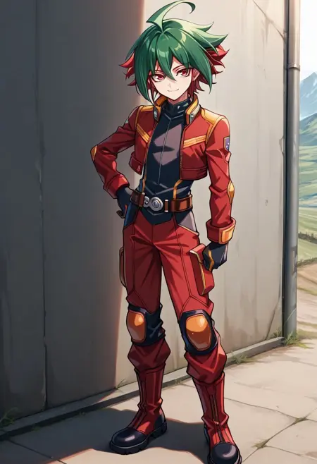 yuya, 1boy, male focus, solo, red eyes, multicolored hair, two-tone hair, green hair, red hair, ahoge, hair between eyes, spiked hair, bangs, pilot suit, jacket, red jacket, gloves, pants, red pants, knee pads, boots, red boots,