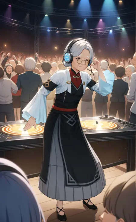 萍姥姥(old Ping):pingll, pingll's def clothes, old woman, old, 1girl, grey hair, black footwear, pingll's dress,