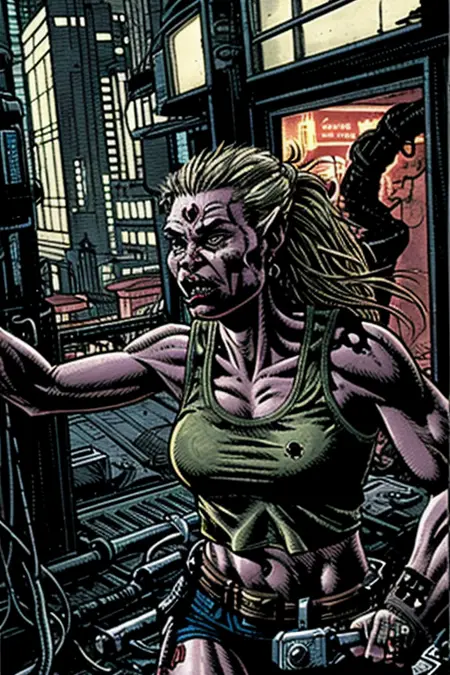 Envisioning a dystopian cyberpunk future ruled by a fusion of man and machine, dreaming up how such a world would look and feel. Back in the late 1980s and early 90s, an exciting new world opened up with RPG's like Shadowrun. Those books' imagery took the reader into a dystopian future by illustrating the cyberpunk world with high contrast, messy and partially disturbing black-and-white ink images. This unique style was used by various artists during that time, just before the advent of computer-aided drawing tools. This model is trained on imagery and drawing techniques employed during that period.