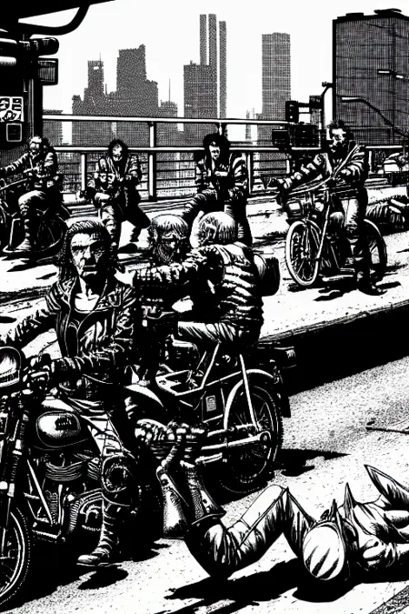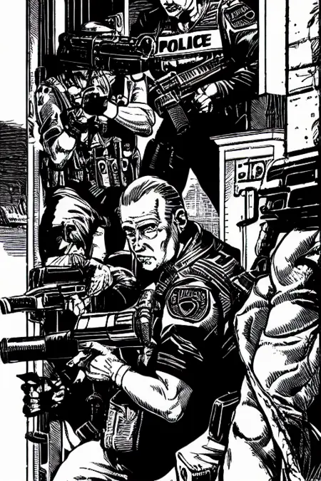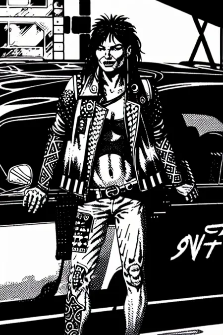 Envisioning a dystopian cyberpunk future ruled by a fusion of man and machine, dreaming up how such a world would look and feel. Back in the late 1980s and early 90s, an exciting new world opened up with RPG's like Shadowrun. Those books' imagery took the reader into a dystopian future by illustrating the cyberpunk world with high contrast, messy and partially disturbing black-and-white ink images. This unique style was used by various artists during that time, just before the advent of computer-aided drawing tools. This model is trained on imagery and drawing techniques employed during that period.