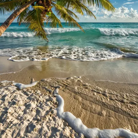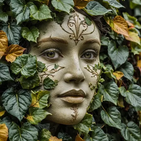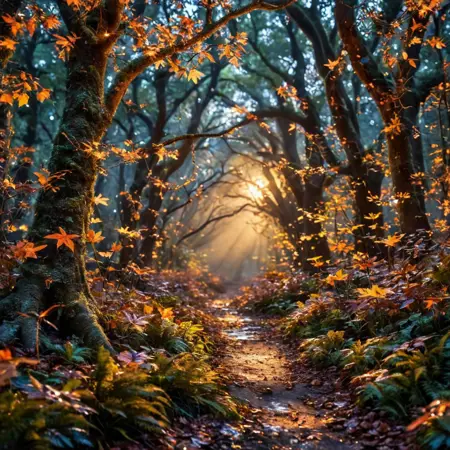 positive: 一个空灵的泻湖,水面呈现出清澈的质感,闪耀着天蓝与绿松石色的渐变,周围是高耸的悬崖,表面带有赤褐色和赭石色的锯齿状纹理,攀附着垂落的藤蔓,其上闪烁着黄绿色与品红色的生物发光孢子;