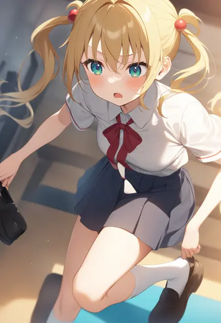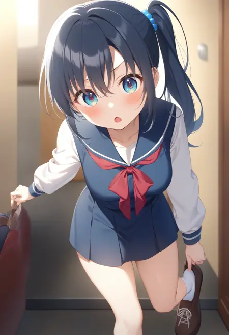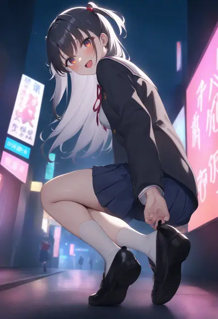 トリガーのみで、さまざまな靴を履くポーズをランダムに生成できますが、「adjusting clothes」「putting on shoes」「shoes」あたりはお守り代わりに添えてください。その後は、立つ、足を上げる、前傾姿勢など、ご自身で望む姿勢の指示を与えることで、その態勢で靴を履いてくれます。