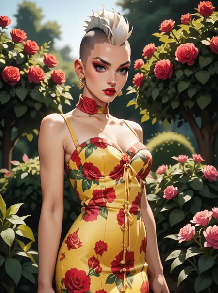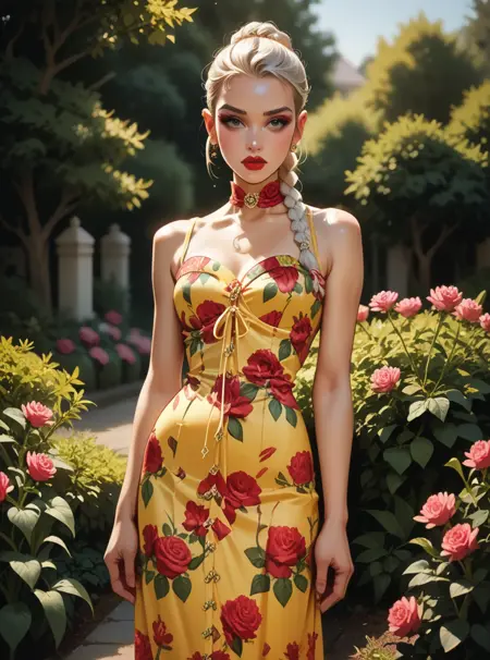 키워드: hud_dk_4, 긴 노란 드레스, 플로럴 프린트, 소매 없음, 초커
