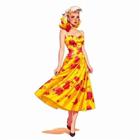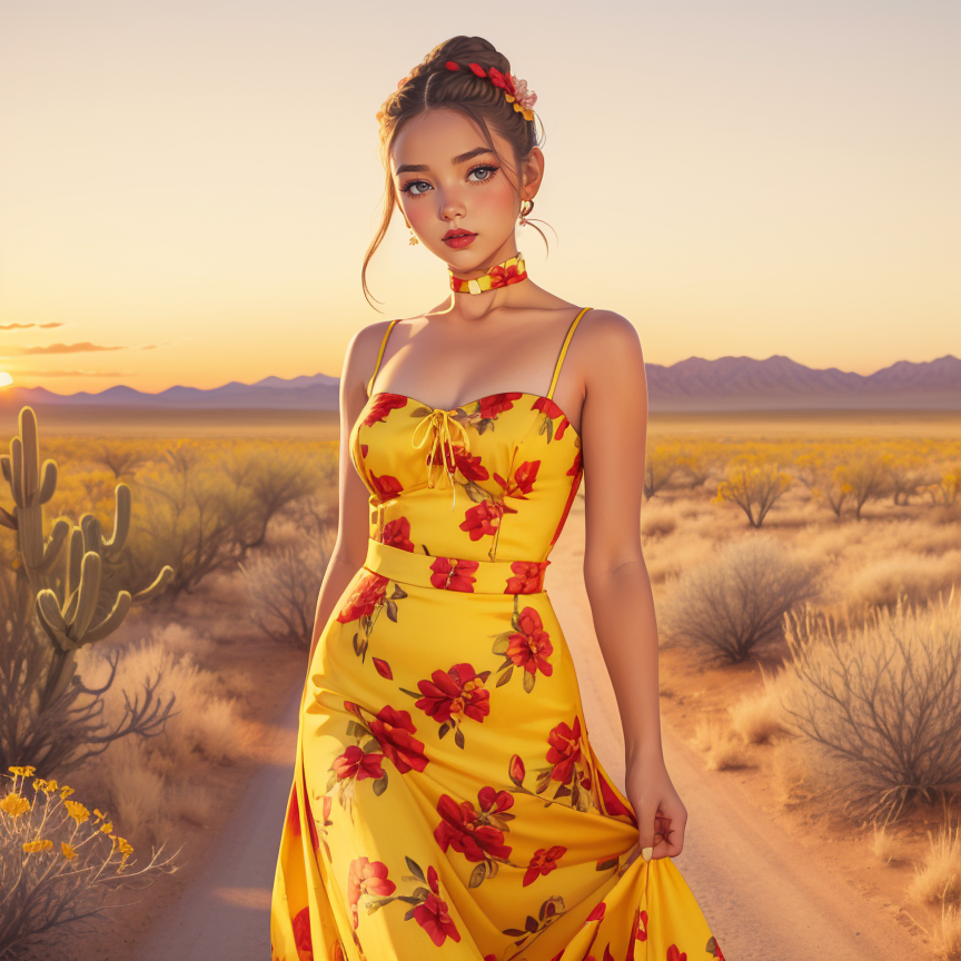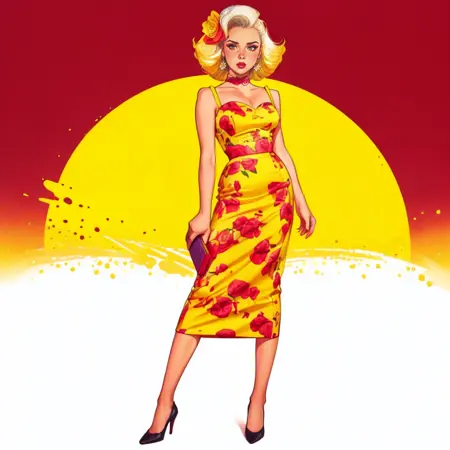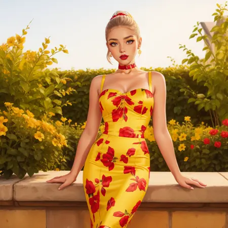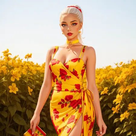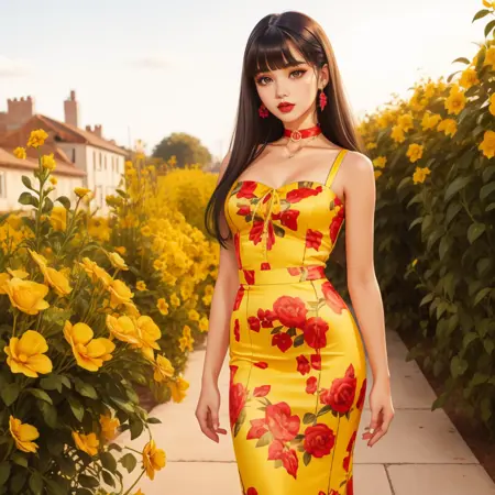 hud_dk_4, long yellow dress, pencil skirt, floral print, sleeveless, choker,