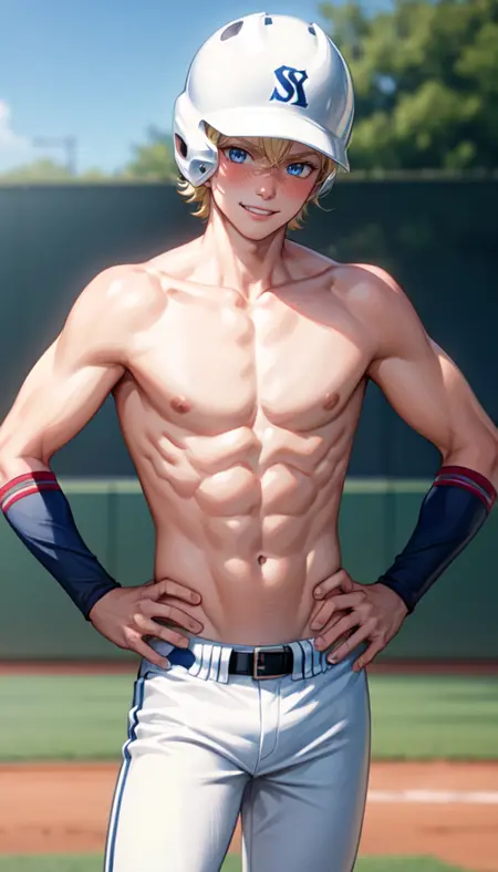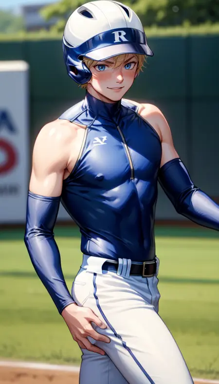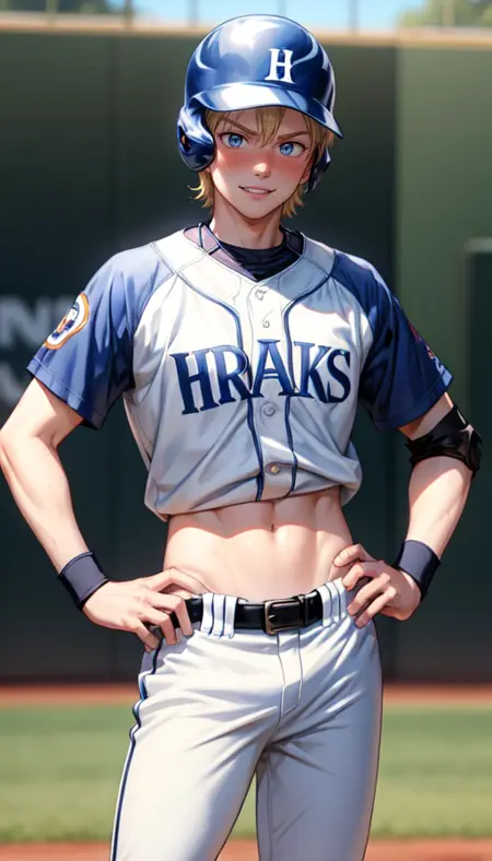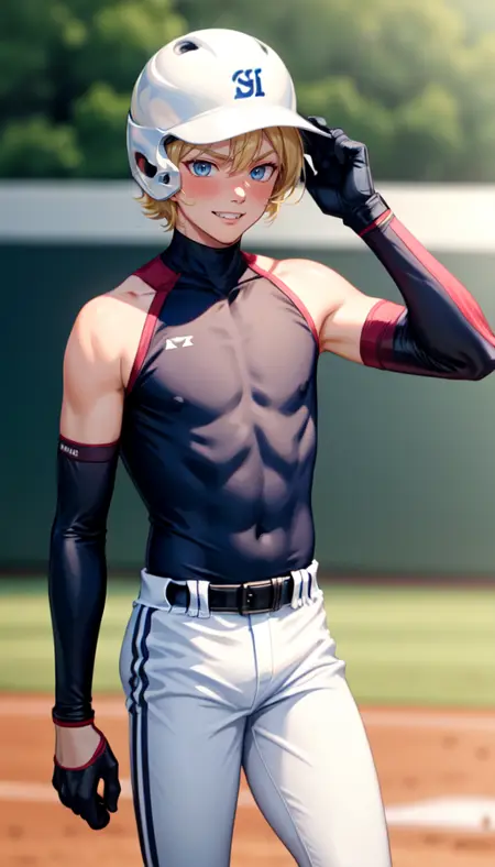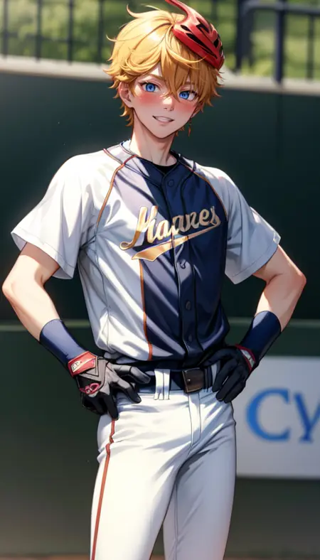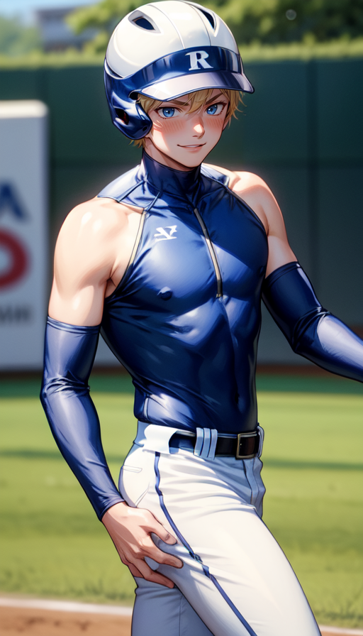 触发词:棒球制服、运动服、裤子、白色裤子、帽子、衬衫、棒球帽、大腿服装、棒球手套、头盔、袜子