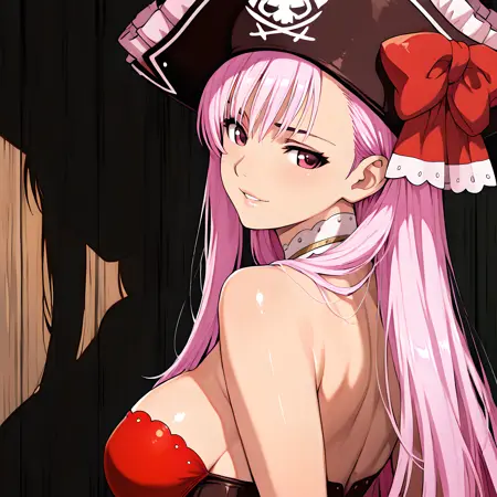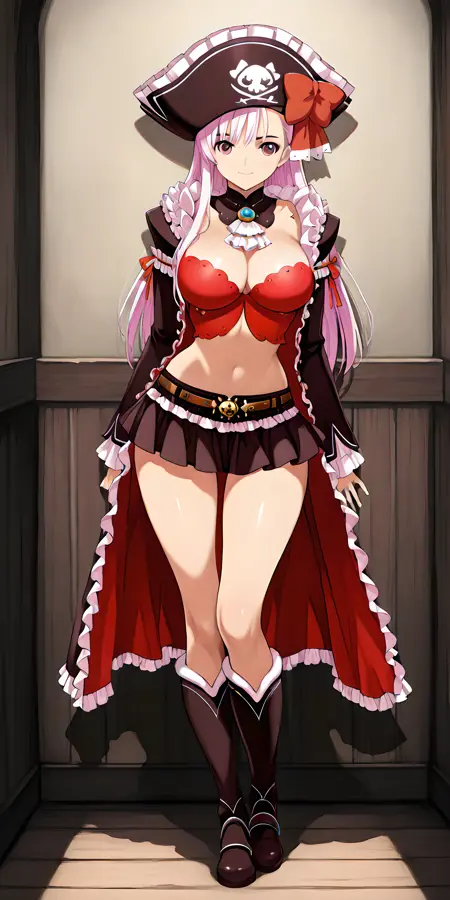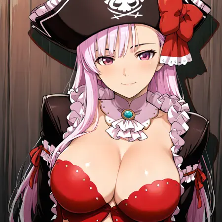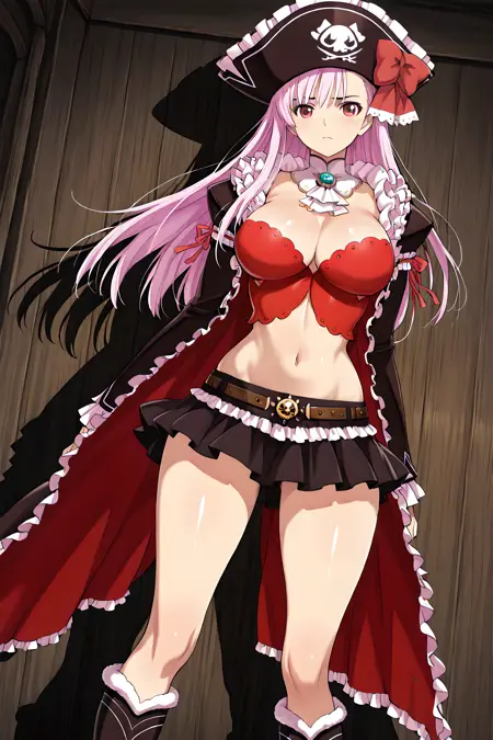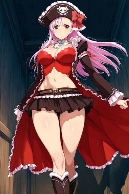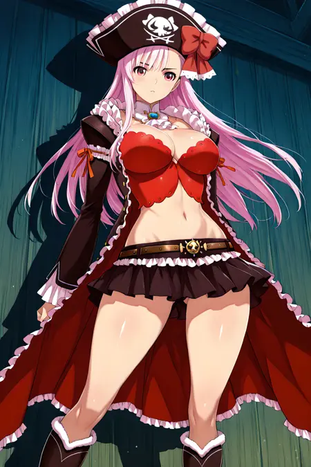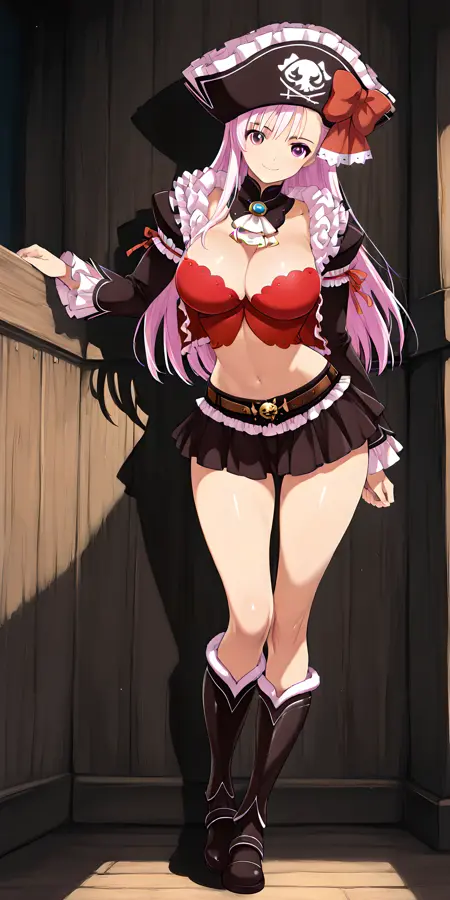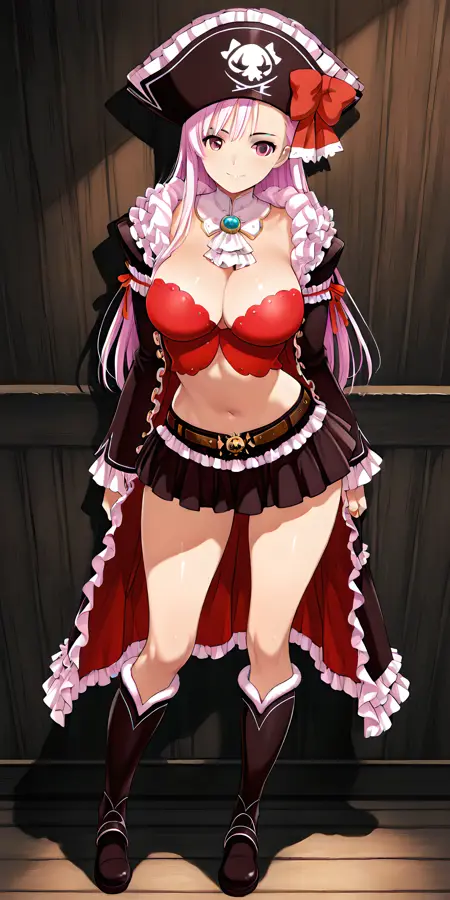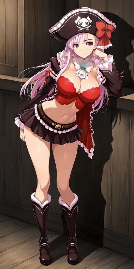 「captain_liliana」で活性化し、外見タグは「長髪、帽子、ピンクの髪、胸、武器、スカート、谷間、ラピエール、ミニスカート、お腹、バストイェア、海賊帽、紫の目」