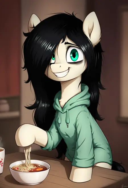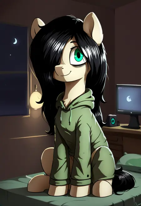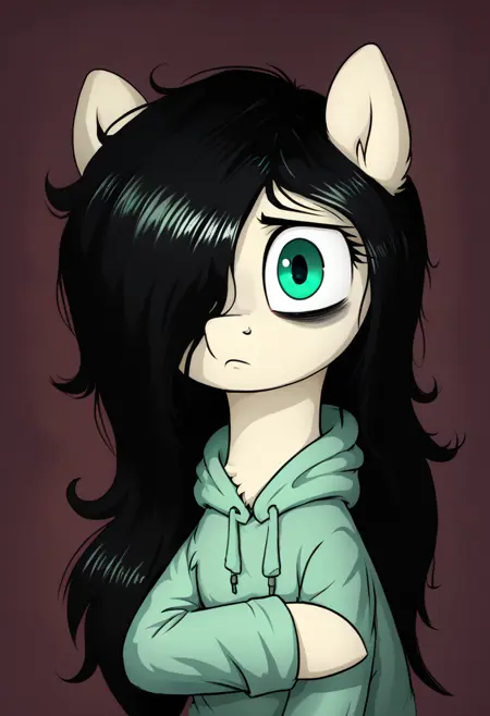 mare, 1girl, fl00rb0red, pony, long hair, green eyes, black hair, hoodie, hair over one eye, bags under eyes,