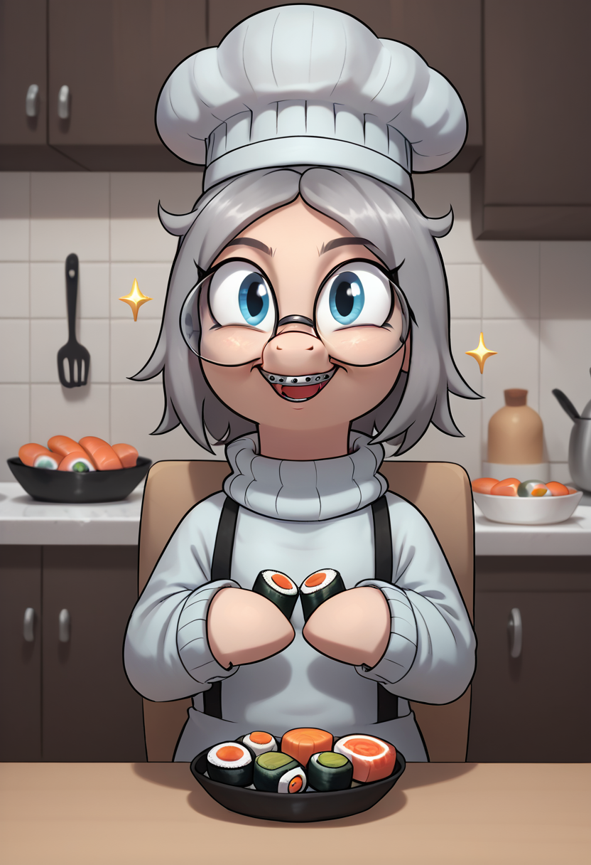 1girl, glasses, t4ku, mare, blue eyes, braces, round eyewear, grey hair, turtleneck