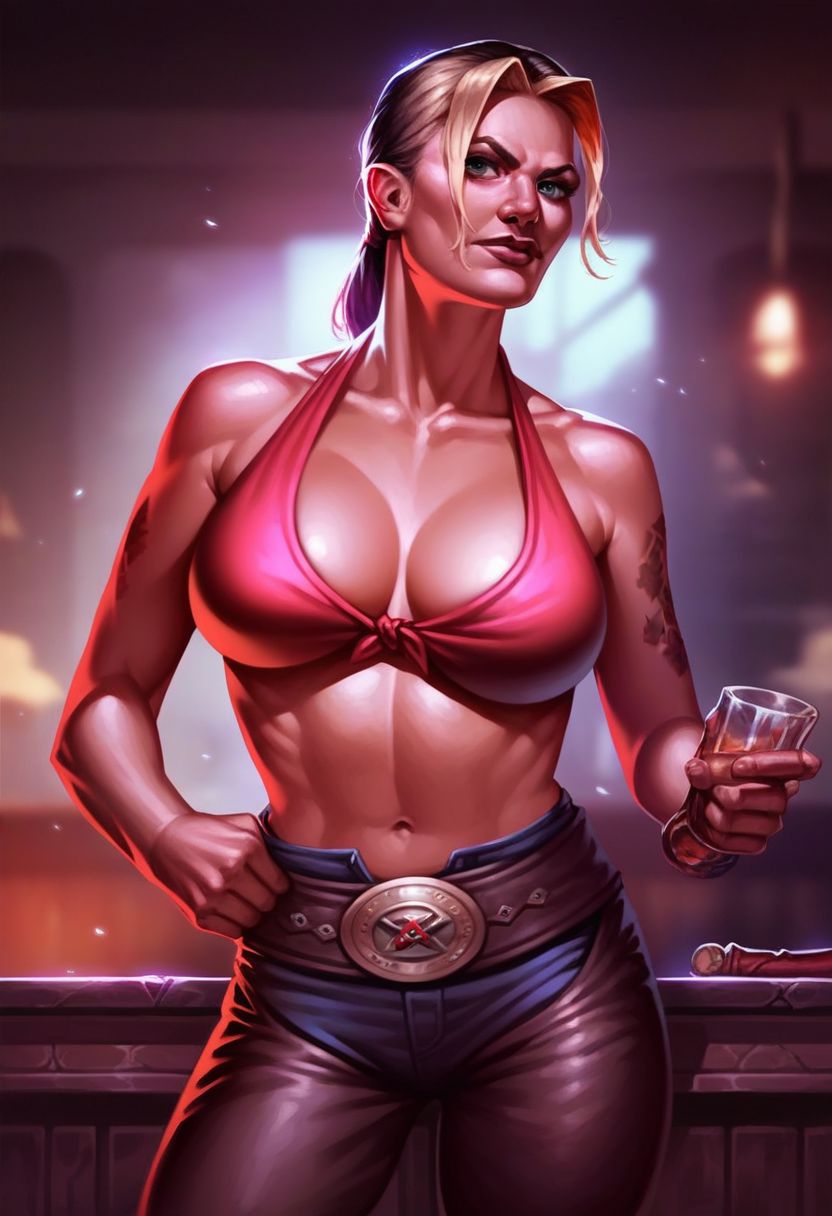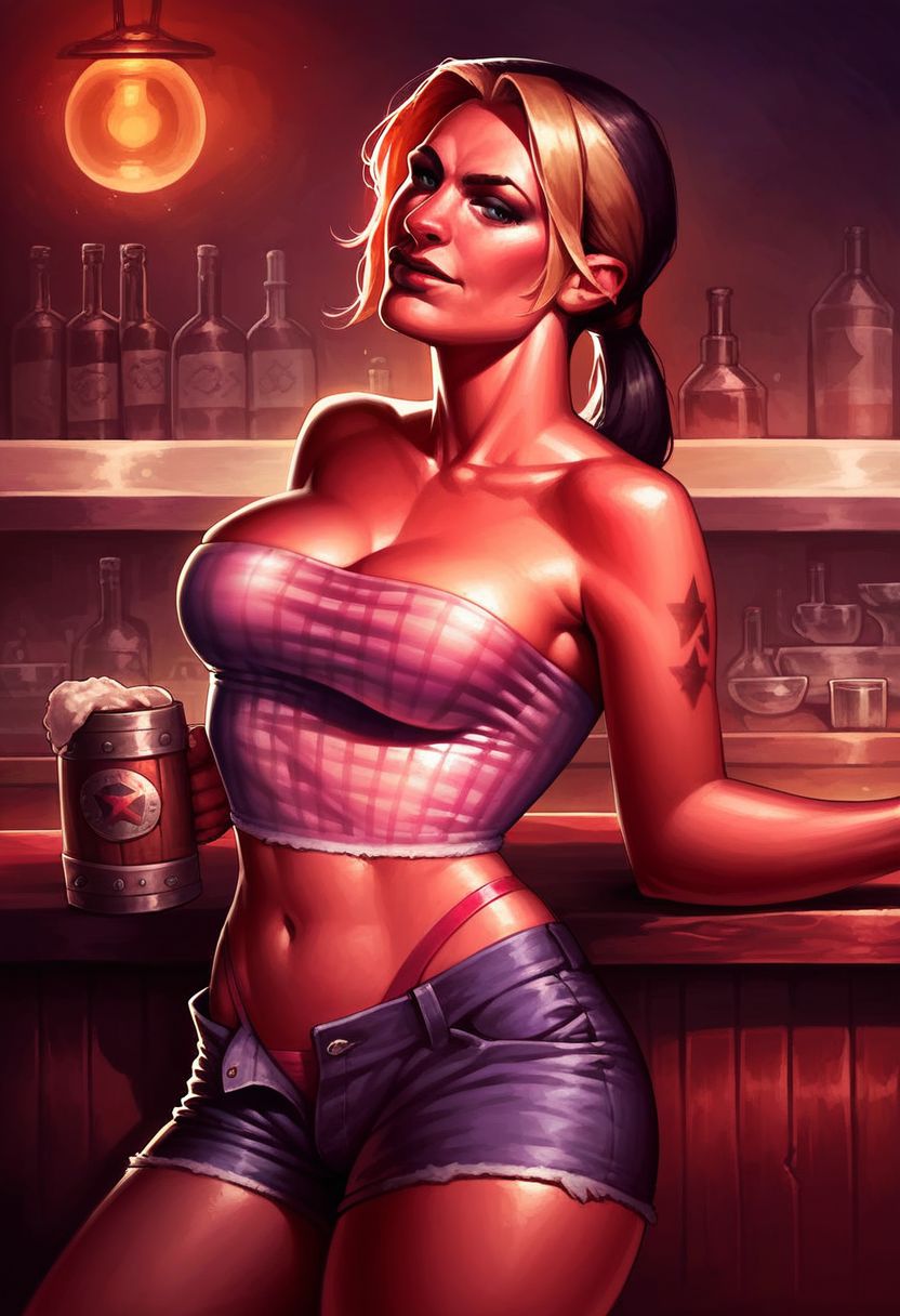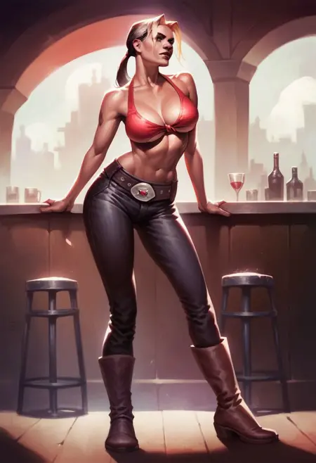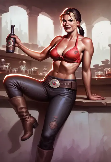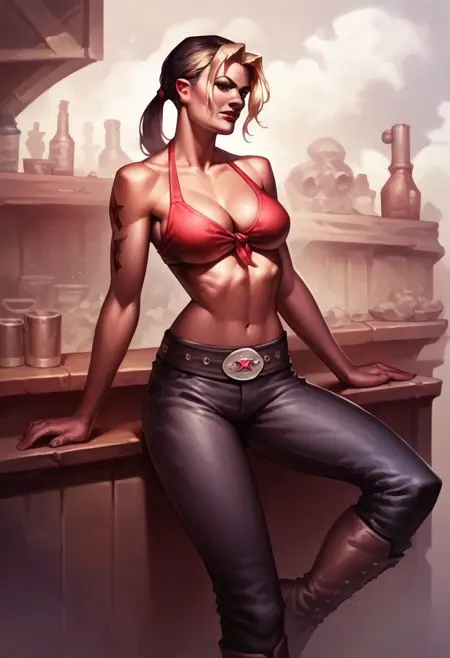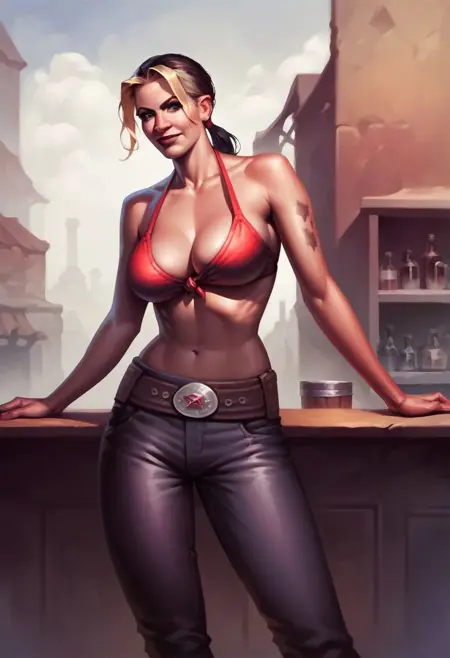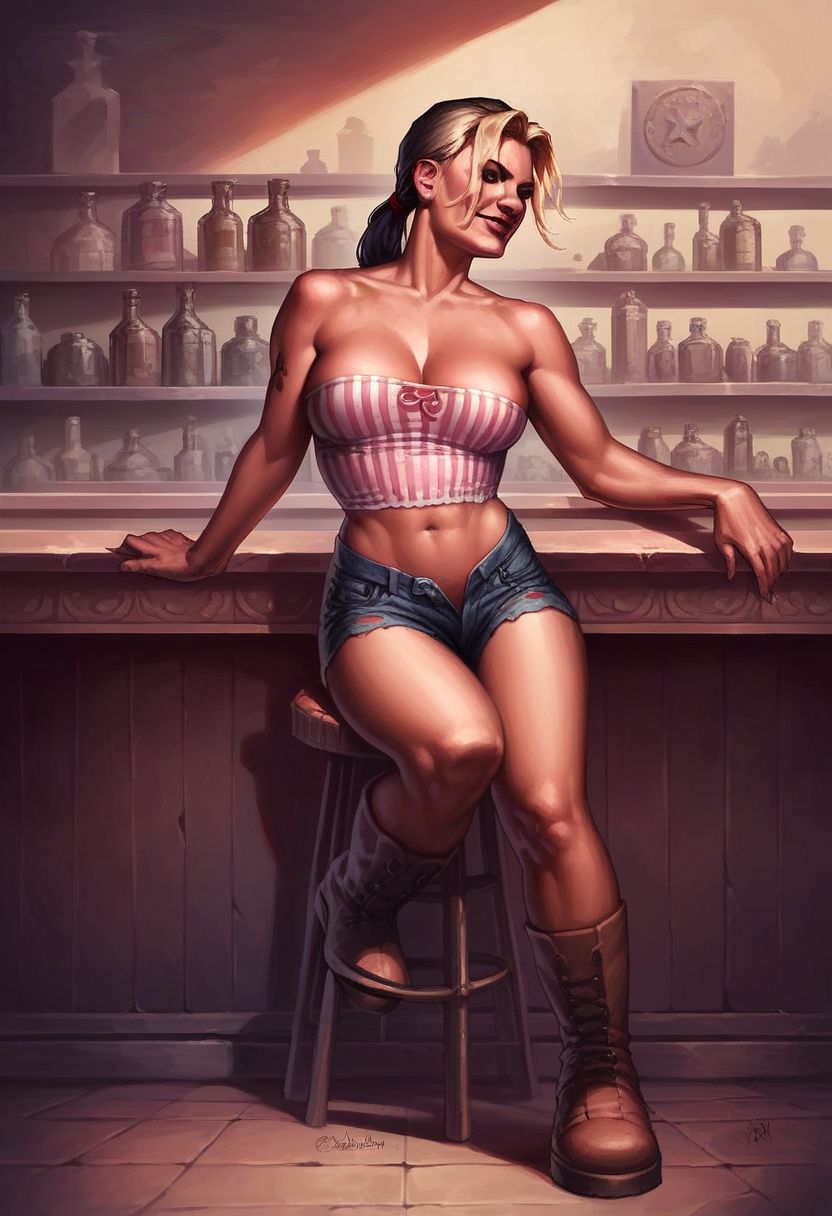 彼女の二つの衣装は、「チューブトップ、デニムショートパンツ、カウボーイブーツ」と「ビキニトップのみ、パンツ、ベルト、カウボーイブーツ」。