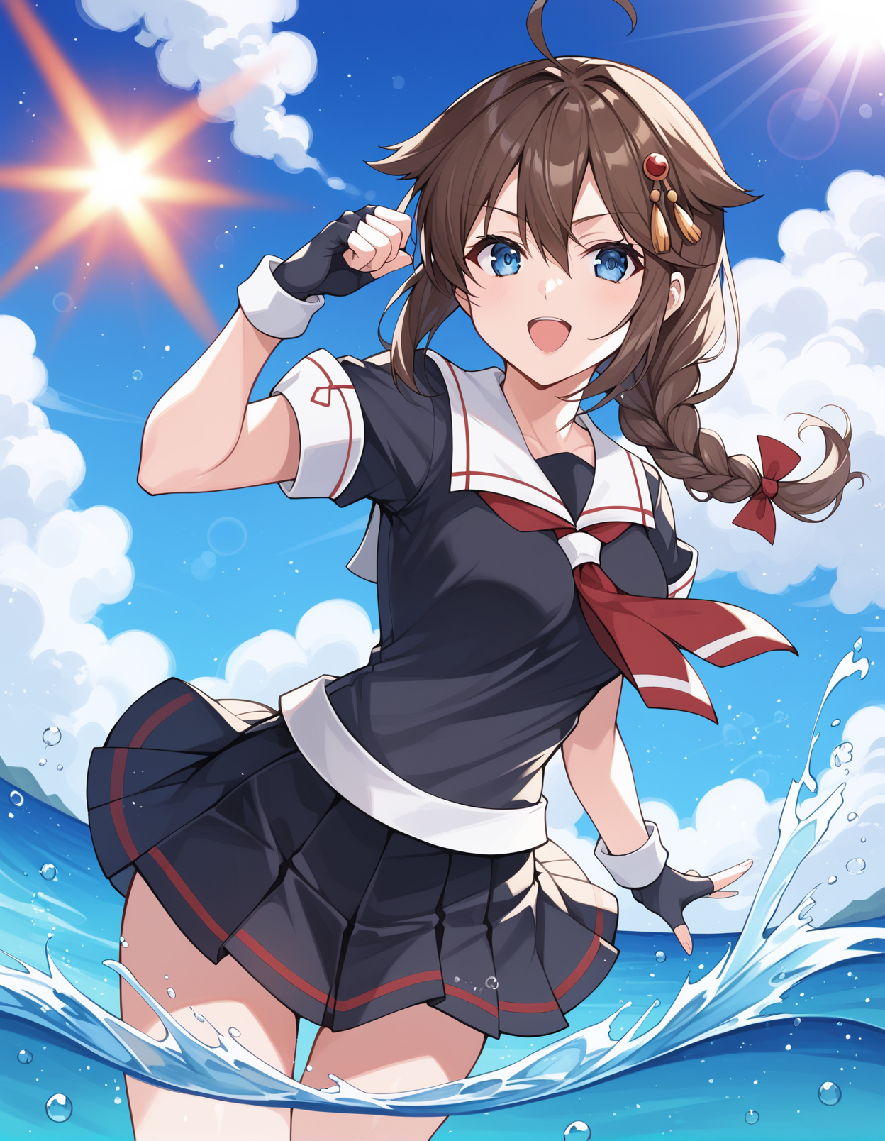 外見:shigure \(kancolle\), 1girl, 青い目, アホ毛, 髪の房, 片方の編み込み, 茶色の髪, 長い髪, 目の間の髪