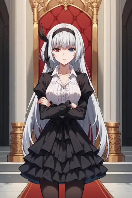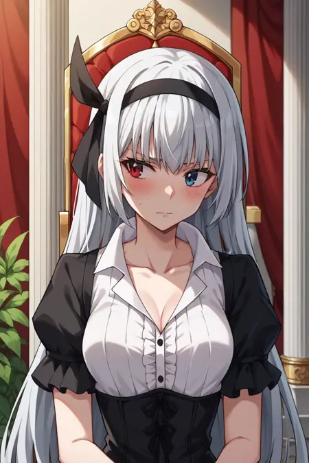 Triggers: white hair, heterochromia, red eyes, blue eyes, long hair, black head band,